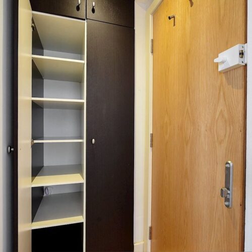 While the flat does not contain a washing machine, the building provides a shared laundry room with both washers and dryers for the use of all residents.