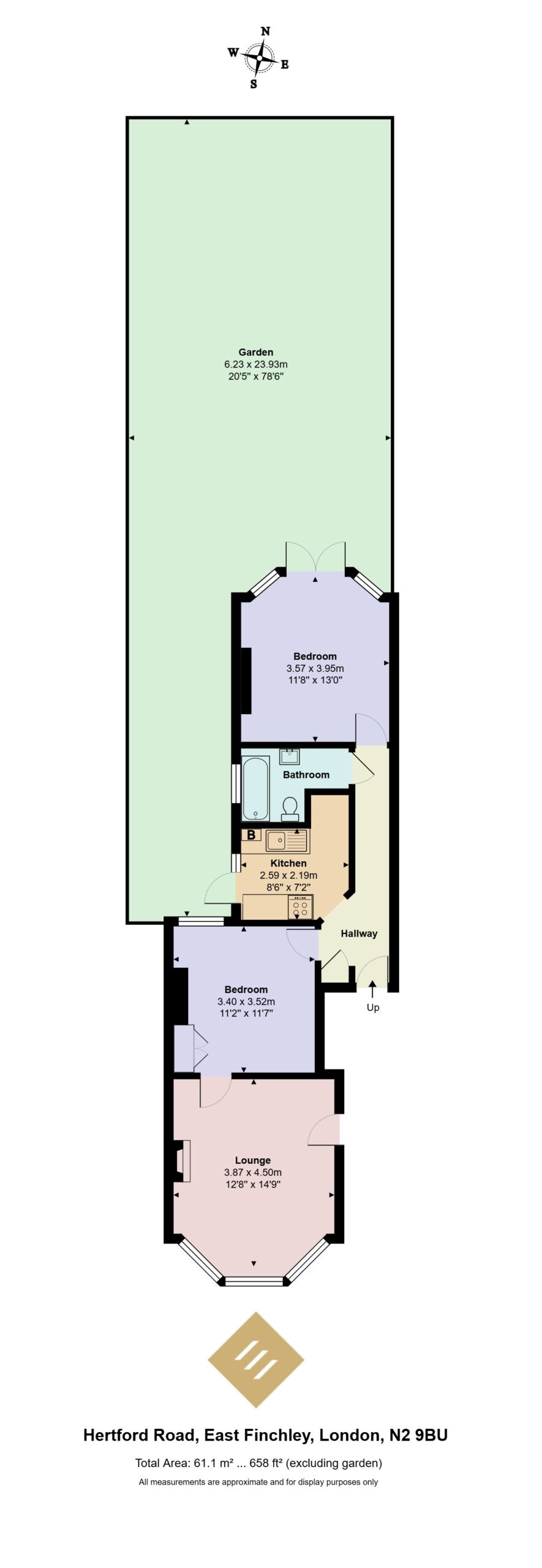 Offering approximately 658 sq. ft. of internal living space, the property comprises two bedrooms, a reception room, a separate kitchen, a family bathroom, and a large private garden to the rear. The garden is accessible both from the kitchen and via a side entrance from the front, providing excellent practicality and scope for entertaining or relaxing outdoors.