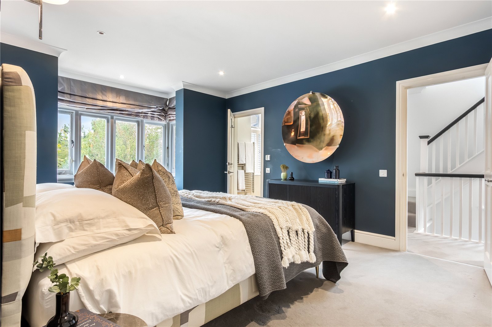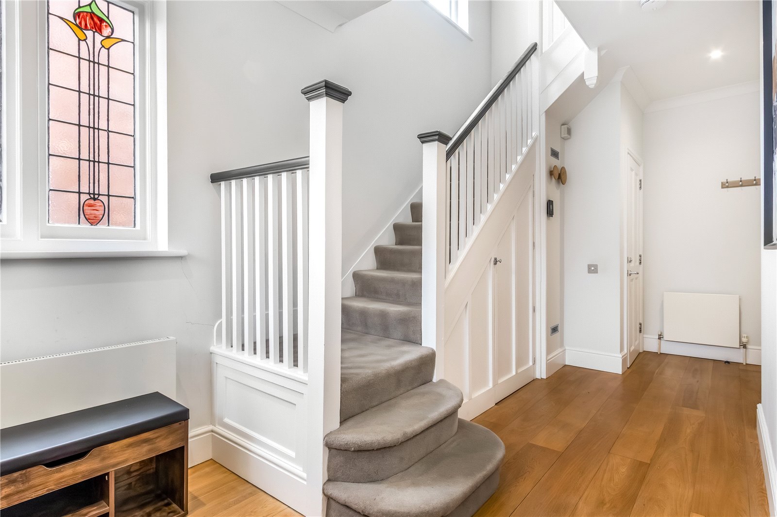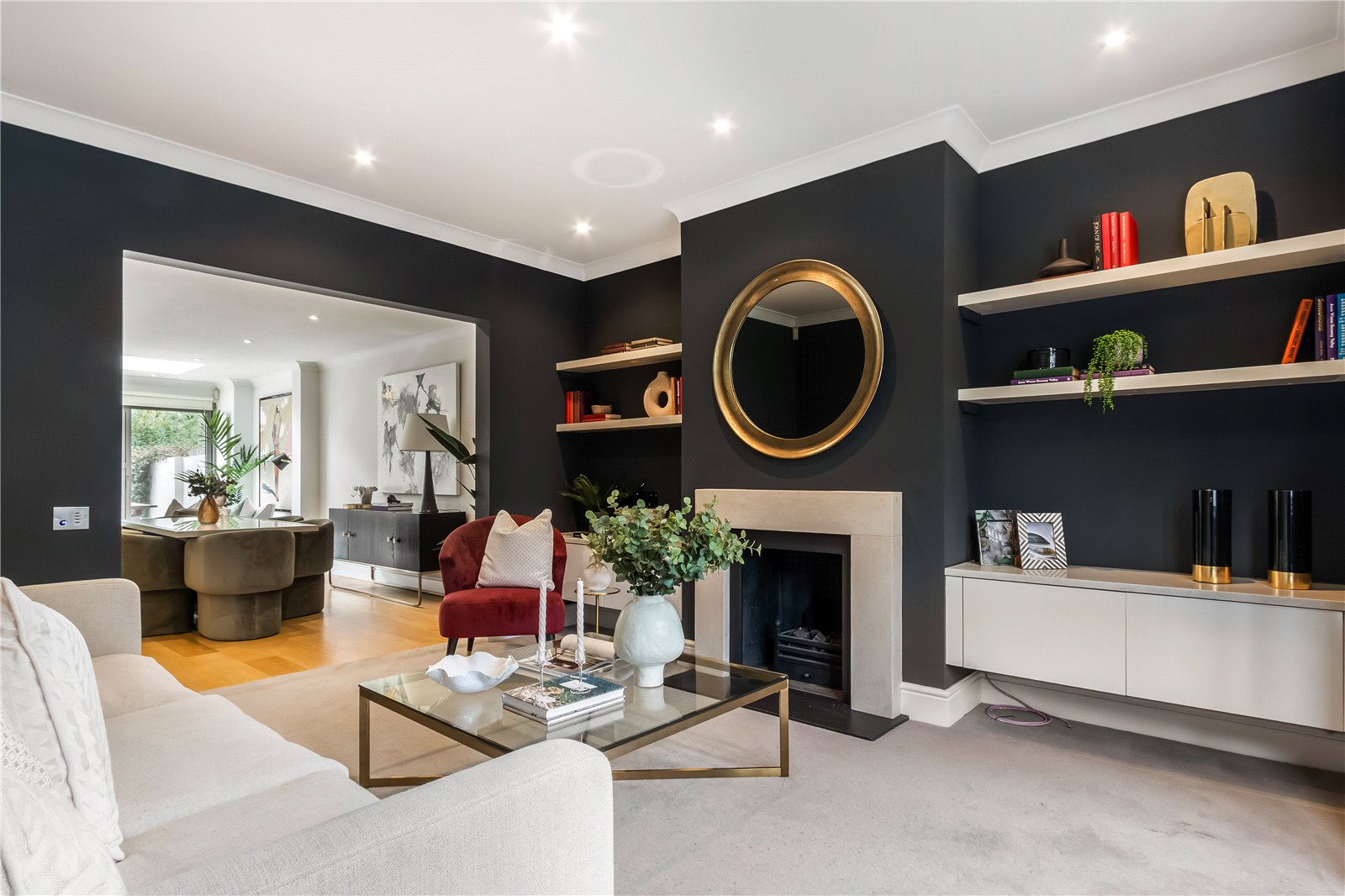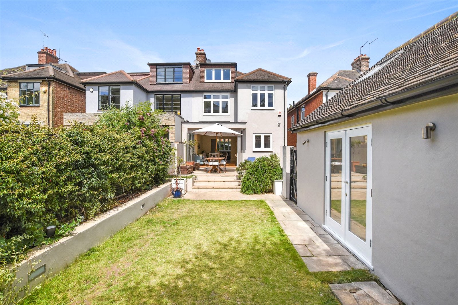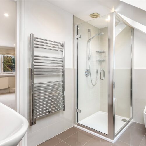Further advantages include a shared driveway to the side, double-glazed windows throughout, and underfloor heating in three bathrooms.