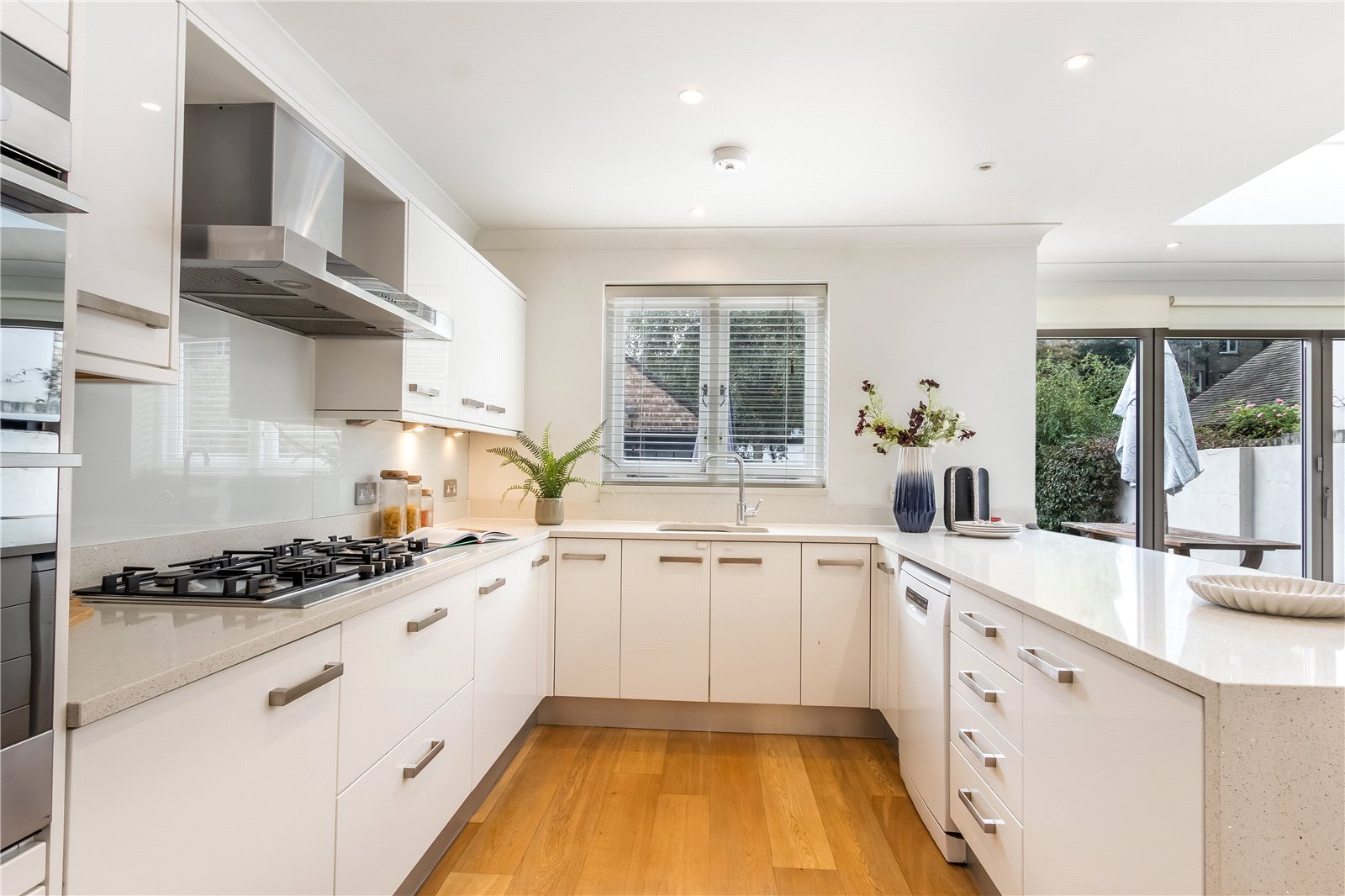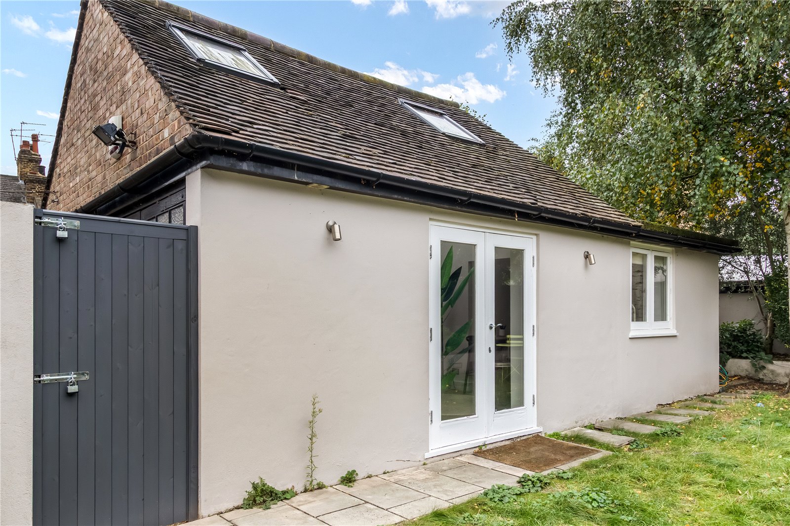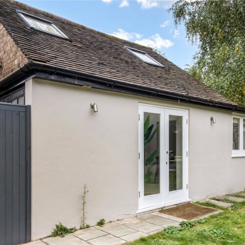 The entrance hallway, finished in wood flooring, leads directly into a large open-plan kitchen and dining area. A feature corner island sits at the centre, creating a perfect focal point for cooking or entertaining. Full-width bi-fold doors open onto a private garden measuring around 60 feet, offering an excellent balance of lawn and patio areas. To one side, a powered outbuilding with mezzanine level includes its own kitchenette and shower room — ideal for use as a studio, office, or guest suite. At the front, a through-lounge provides a separate yet flexible living space.