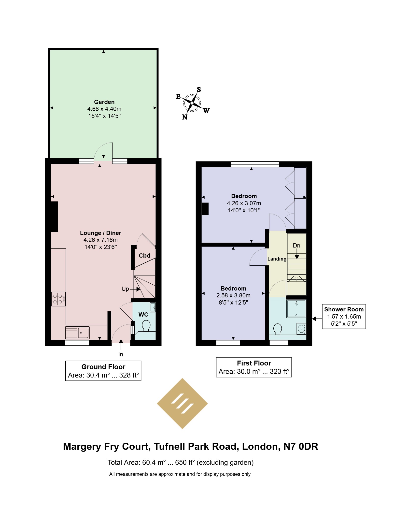 Offering approximately 650 SQ FT (60 SQM) of well-designed living space, the property features two generously sized double bedrooms, a bright and airy open-plan living, dining, and kitchen area, a stylish bathroom, and a convenient downstairs W/C. The home also benefits from a private south-facing front garden, set back from the road, and enjoys its own direct access from the street for added privacy and ease.